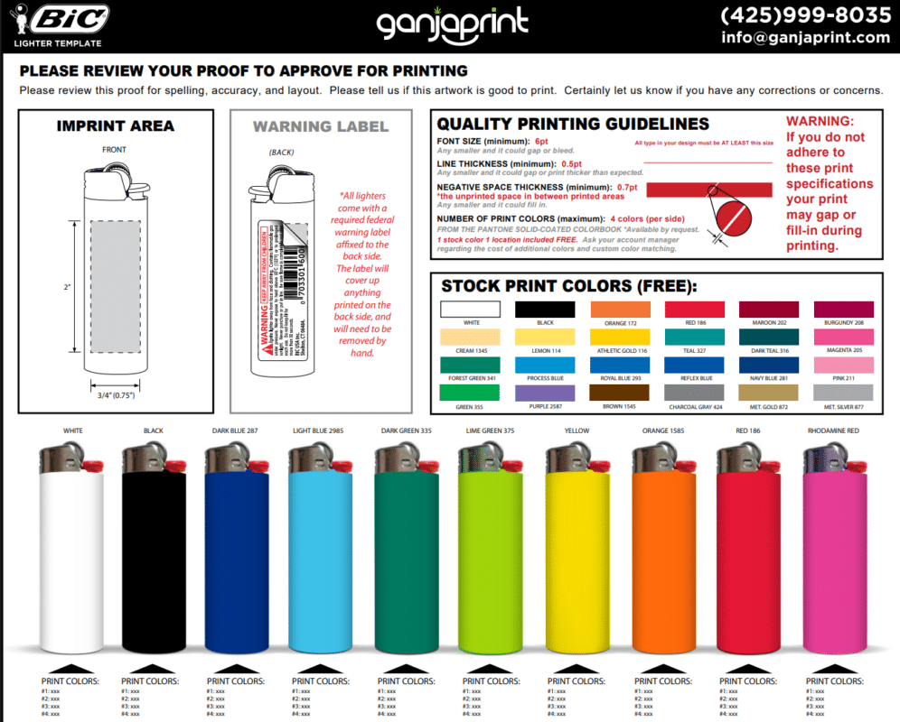 GanjaPrint helps you customize your own Bic Lighters with your design.  1-4 imprint colors available front and back.